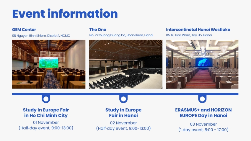 La Délégation générale Wallonie-Bruxelles au Vietnam a le plaisir de participer aux Salons "Study in Europe 2025", qui auront lieu à Hochiminh-ville, le samedi 1er novembre 2025 (09h00 - 13h00) et à Hanoi, le dimanche 2 novembre 2025 (09h00 - 13h00).